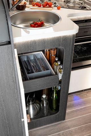 在 Roller Team Zefiro 696 中獲得五星級酒店的感覺。一張帶有床下儲物空間的後島床、床頭櫃和兩個衣櫃都通過滑動門關閉,提供了通常只有在外出時才能夢想的隱私和寧靜酒店。就在這前面,您會發現與浴室的其餘部分分開的家庭式淋浴間。廣受歡迎的 L 形休息區採用精美的 Paola 軟家具,白天最多可容納 5 人就座,為放鬆和娛樂提供溫馨的空間。到了晚上,Zefiro 696 精緻的身體曲線中的第二張雙人床使用平穩的電動機構降低到休息室上方。